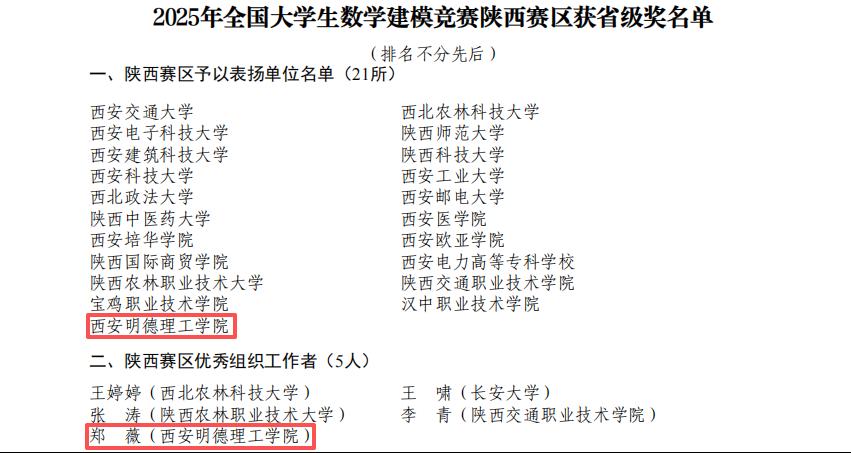 11月28日,2025年“高教社杯”全国大学生数学建模竞赛成绩揭晓。经过激烈的角逐,我校共获得本科组国家二等奖2项,陕西赛区省一等奖10项,二等奖22项;专科组国家二等奖1项,陕西赛区省一等奖3项,二等奖1项,学...