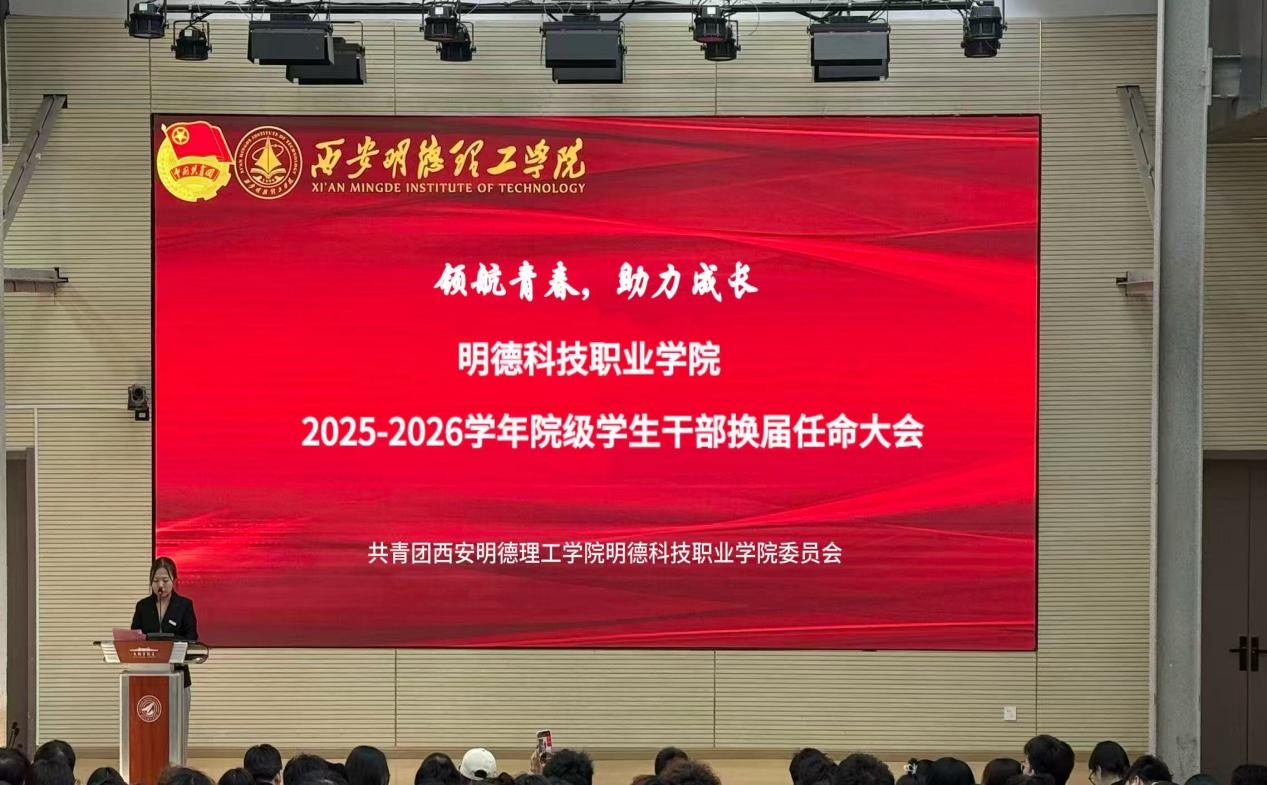 11月20日中午,明德科技职业学院2025-2026年学年学生干部任命会在莲湖校区尚德报告厅召开。学院党总支副书记王飞,团委书记郭庆,辅导员刘洁、张璐、吴星澎老师、团学干部及部门干事、入党积极分子、入团积极分子...