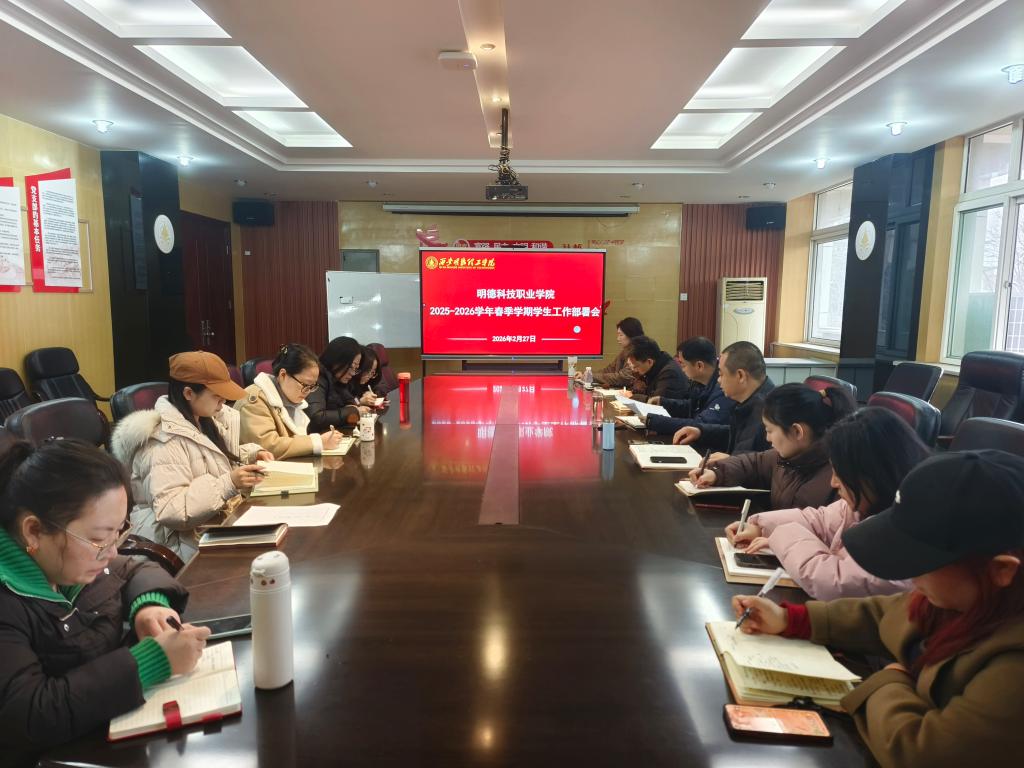 为落实学校2026年春季学期开学各项工作要求,2月27日上午,明德科技职业学院在明理楼216会议室召开春季学期学生工作部署会,学院党总支书记王庭良、副书记王飞及全体辅导员参会。会议聚焦新学期学生安全稳定、日...