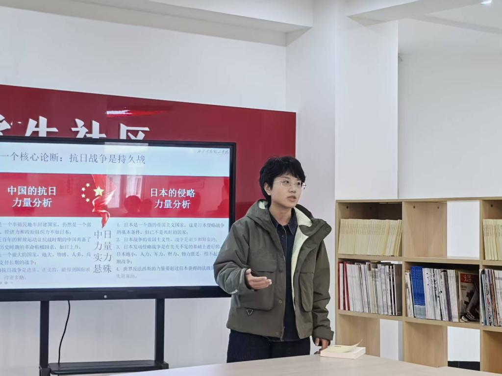 分享会上,王婉菲老师首先带领大家走进了毛泽东同志的经典著作《论持久战》。她结合历史背景,深入浅出地剖析了这部著作的核心思想、战略战术及其在特定历史时期所发挥的巨大作用。王老师强调,《论持久战》不仅是一部光辉的军事理论文献,更蕴含着丰富的哲学智慧和方法论,其所揭示的战略定力、辩证思维以及依靠人民、坚信胜利的精神,对于当代青年正确认识复杂形势、把握发展规律、培养坚韧不拔的意志品质依然具有深刻的启示意义。她鼓励同学们从经典中汲取力量,学会运用历史的、辩证的视角观察和分析问题。