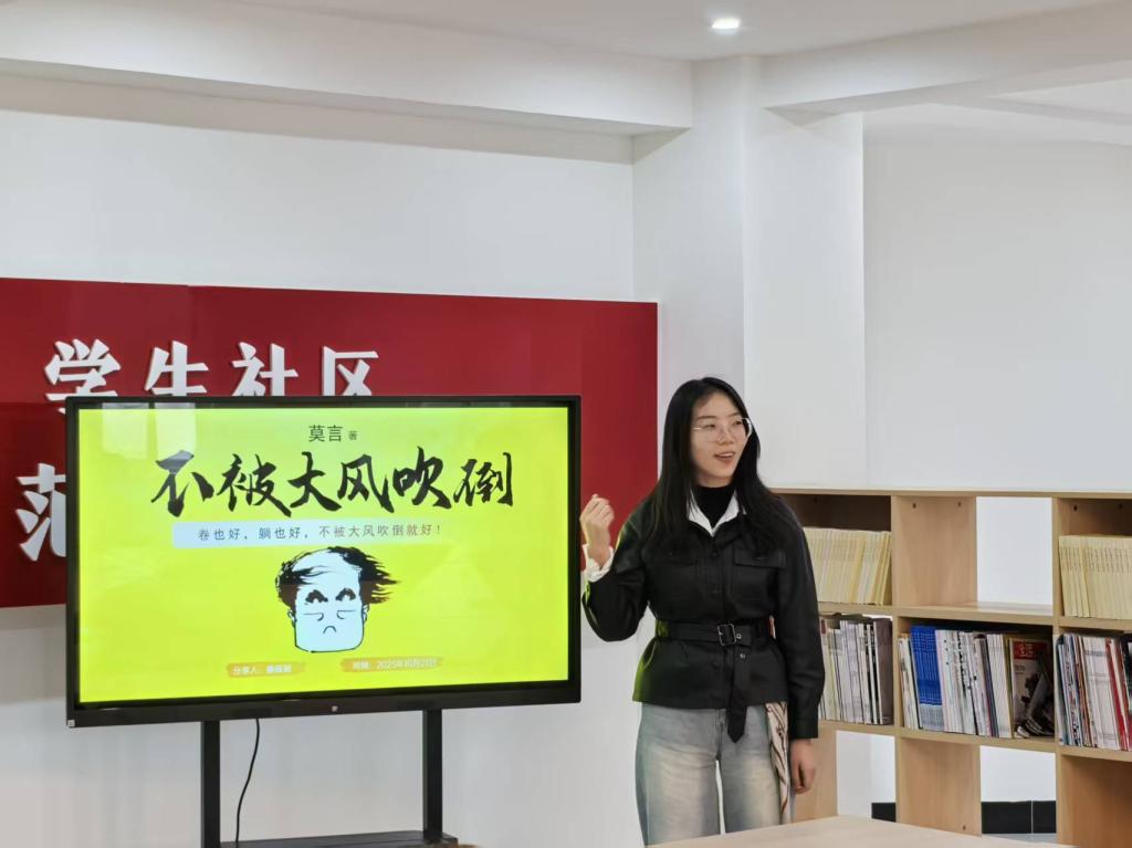 随后,徐钰琛老师与同学们分享了《不被大风吹倒》一书的阅读体会。她从当代青年面临的现实挑战与心理状态出发,结合书中内容,探讨了如何在快速变化、竞争激烈的社会环境中保持内心的定力,抵御各种“大风”的侵袭。徐老师通过生动的案例和亲切的互动,分享了关于应对压力、管理情绪、树立积极心态以及建立支持系统等方面的思考与建议。她寄语同学们,要勇于面对成长路上的困难与挫折,培养强大的心理韧性,找到属于自己的“锚点”,从而在人生的航程中“不被大风吹倒”,稳步前行。