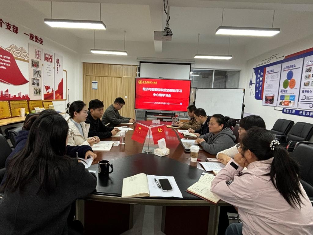 10月23日,经济与管理学院在明志楼北606会议室召开党委理论学习中心组学习会,学院党委委员、各党支部书记和团委书记参加会议。会议由学院党委书记何文举主持。