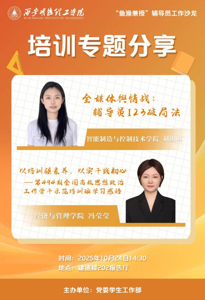 10月24日,学校在建德楼202报告厅举办“鱼渔兼授”辅导员工作沙龙,特邀智能制造与控制技术学院辅导员刘玥琳与经济与管理学院辅导员冯莹莹进行专题分享。本次沙龙旨在通过交流研讨,促进辅导员队伍专业化、职业化发展,提升育人实效。全校辅导员共同参与了此次活动。