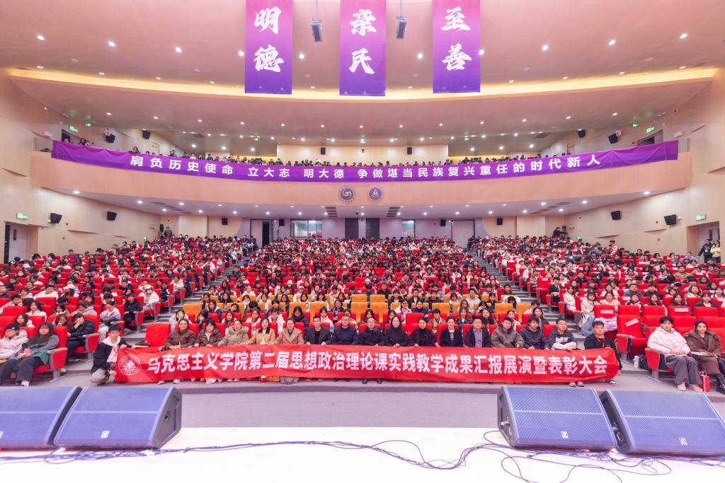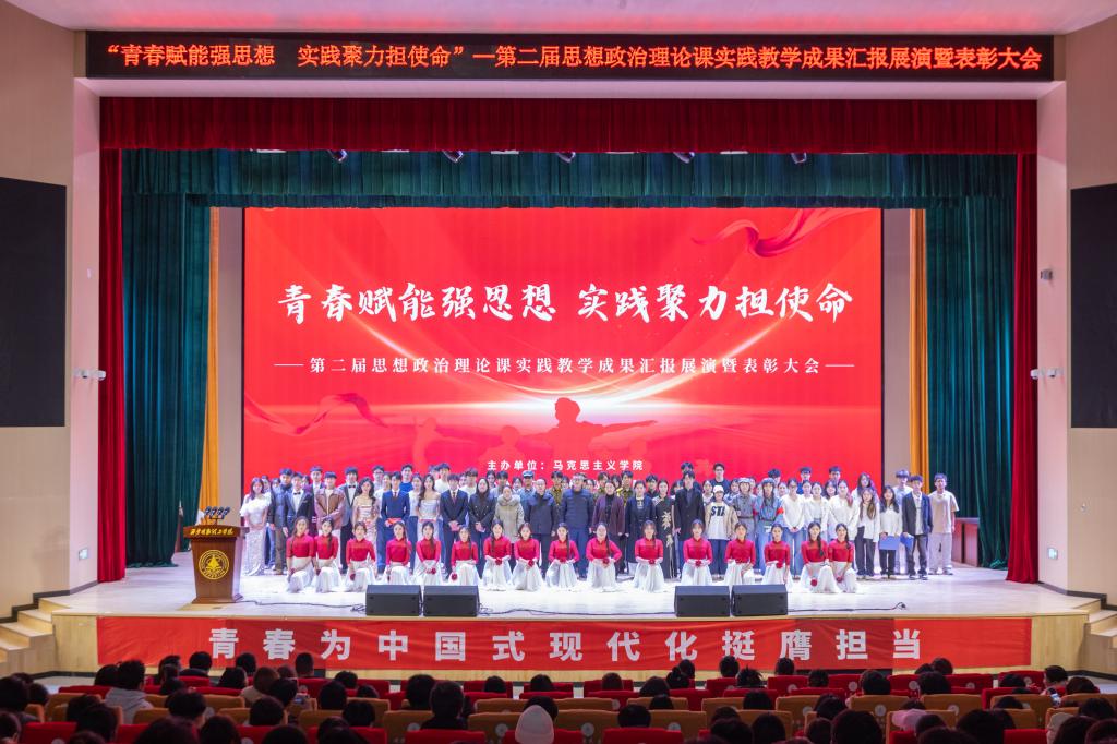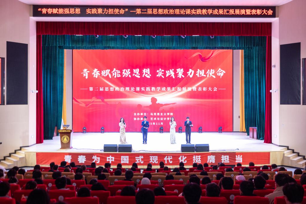 为深入推进思想政治理论课实践教学改革,充分展示思政教育育人成果,2025年11月25日晚,马克思主义学院 “青春赋能强思想,实践聚力担使命” 第二届思想政治理论课实践教学成果展演暨优秀作品表彰大会在四季廊桥报告厅隆重举行。学院党委书记王君涛、副院长惠斌,全体思想政治理论课教师以及获奖学生代表、各年级学生代表共1000余人齐聚一堂,共同见证思政实践育人的丰硕成果,共话新青年的责任与担当。