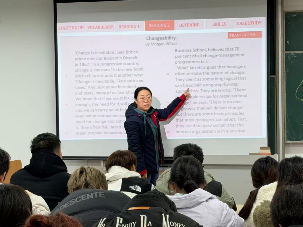 11月17日上午,经济管理学院余露露老师在2号楼201教室主讲《剑桥商务英语》示范课,聚焦“changeability”等核心概念。余老师通过情境模拟、案例分析,引导学生在真实商务场景中灵活运用英语进行沟通,有效提升了学生的专业语言应用能力和跨文化交际意识,体现了“学以致用”的教学理念。