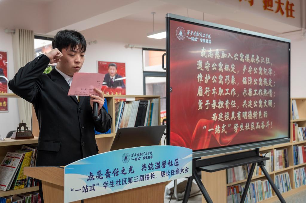 竹苑南楼长王富灿作为楼层长代表发言。他表示楼层长们将以“自我管理、自我服务、自我教育、自我监督”为原则,围绕学校中心工作,全心全意为社区同学服务,以坚定的身姿传递温情,用青年人的担当奉献精神,为我校“一站式”学生社区综合管理模式以及宿舍网格化管理贡献青春力量。