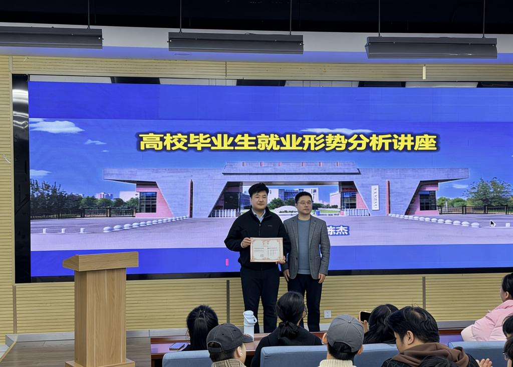 陈杰主任以《当前就业形势分析与政策解读》为主题,为在场师生带来了一场内容详实、干货满满的就业指导分享。讲座中,他结合自身多年高校就业创业管理与指导工作经验,立足全国及陕西省高校毕业生就业整体环境,全面研判了当前就业市场供需格局、行业结构性矛盾,以及不同毕业生群体的就业特征与现实困境。系统解读了国家及陕西省面向高校毕业生出台的全链条就业创业扶持政策。最后紧扣毕业生求职全流程核心需求,围绕职业规划设计、求职路径选择、考公考编备考等毕业生普遍关注的热点问题,给出了应对策略及建议。整场讲座既帮助同学们厘清求职思路、规避就业误区、精准把握政策机遇,也引导大家树立“先就业、再择业、能创业”的理性就业观,鼓励同学们主动抢抓发展机遇,科学规划职业发展路径。本次讲座时长近两个小时,现场秩序井然,师生全程认真聆听、详细记录。活动中还为陈杰老师颁发了《西安明德理工学院就业导师聘书》,后续学校将依托陈导师专业优势与就业资源,为我校毕业生提供更具针对性、专业性的就业指导与帮扶。