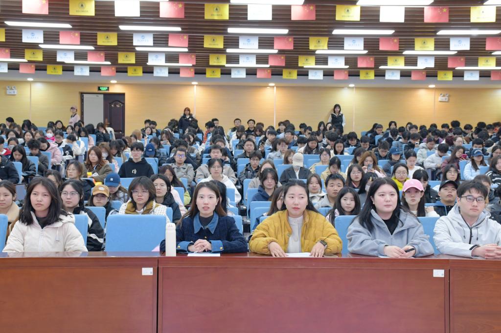 金鸽老师以《读懂两会“稳”信号,青春挺膺“敢”担当》为题,深入分析了在当前世界近80年来最严峻的动荡周期下,中国顶住内外部压力、实现稳中有进的难能可贵,阐释了“中国之稳”作为定海神针的深刻价值。紧扣政府工作报告,系统解读了国家在稳增长、稳创新、稳民生、稳安全四大方面的核心部署与务实举措。最后,她号召青年学子要坚定信念、扎根实践、勇于创新、守牢底线,将个人的青春行动融入国家稳定与发展的大局,共同筑牢美好生活的基础。