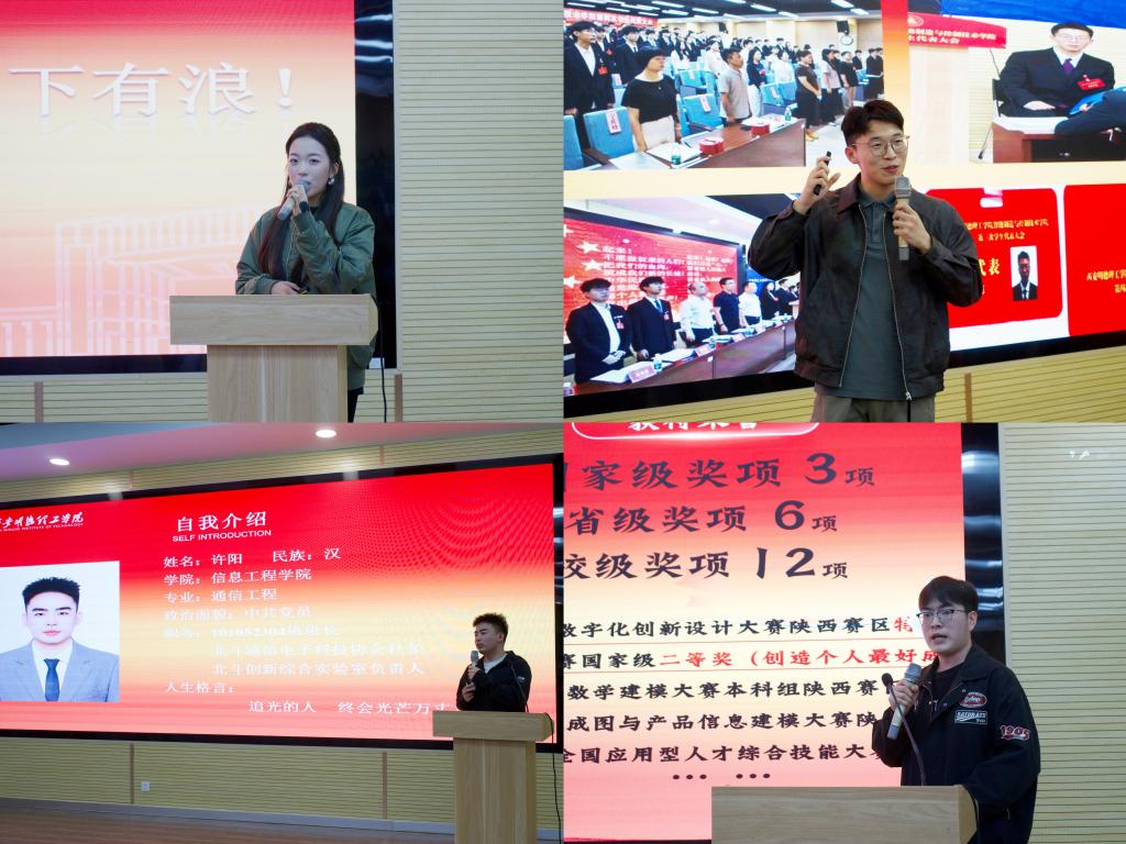 随后,四位国家奖学金获得者分享了各自的成长经验。信息工程学院李雨璇以《厚植于思深耕于学奔涌于行》为题,分享了英语四六级备考与学习方法;许阳在《学赛双向奔赴,青春滚烫前行》中,讲述了平衡理论学习与竞赛实践的心得。智能制造与控制技术学院段宇彤围绕《以学筑基以赛促学》,阐述了如何融通专业学习、学科竞赛与社会实践;段立国则以《路漫漫其修远兮,吾将上下而求索》为题,结合学生工作与竞赛经历,分享了全面发展的心路历程。在随后的互动环节,同学们围绕时间管理、竞赛入门等话题踊跃提问,学长学姐给予了细致解答,现场气氛热烈。四位宣讲人的故事朴实而深刻,经历真实而动人,他们用奋斗的笔触书写了精彩的青春篇章,为在场同学提供了可学、可感、可及的成长范本。