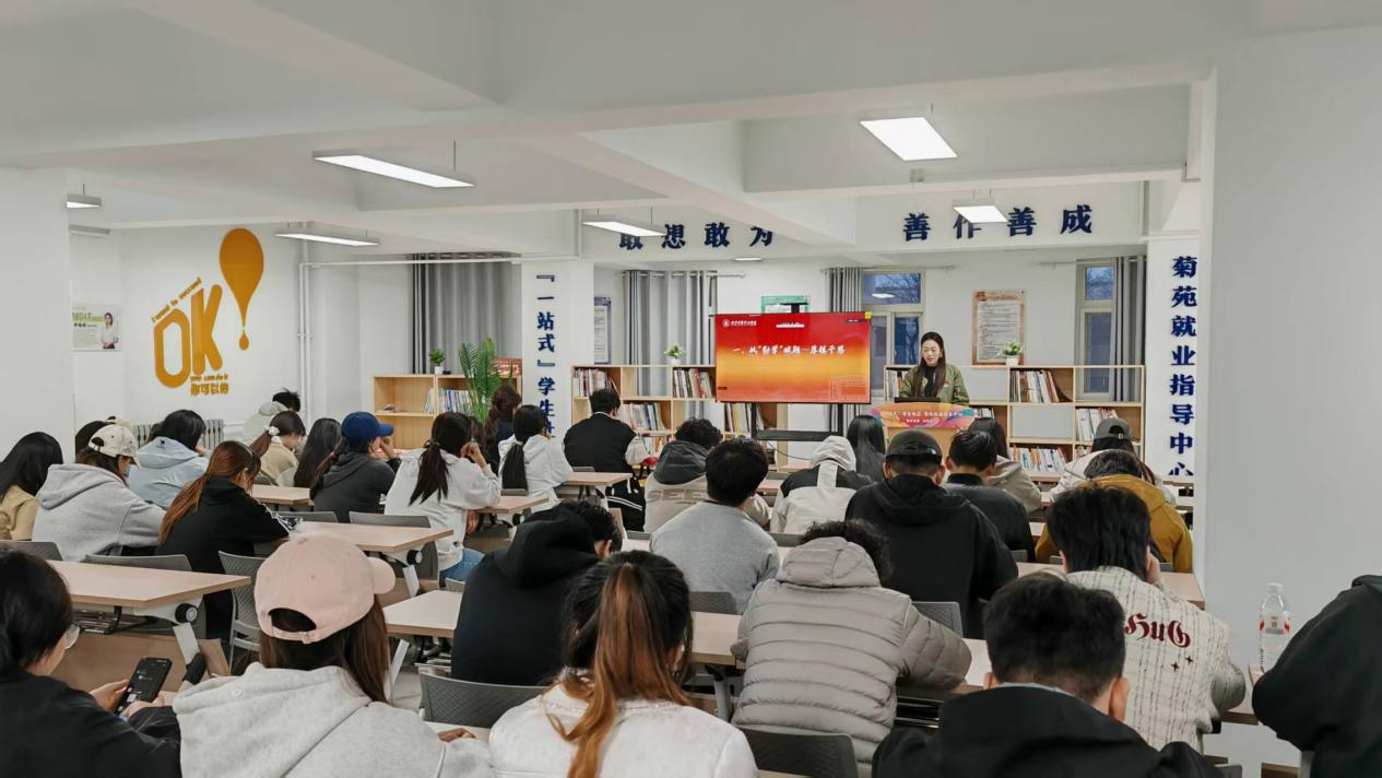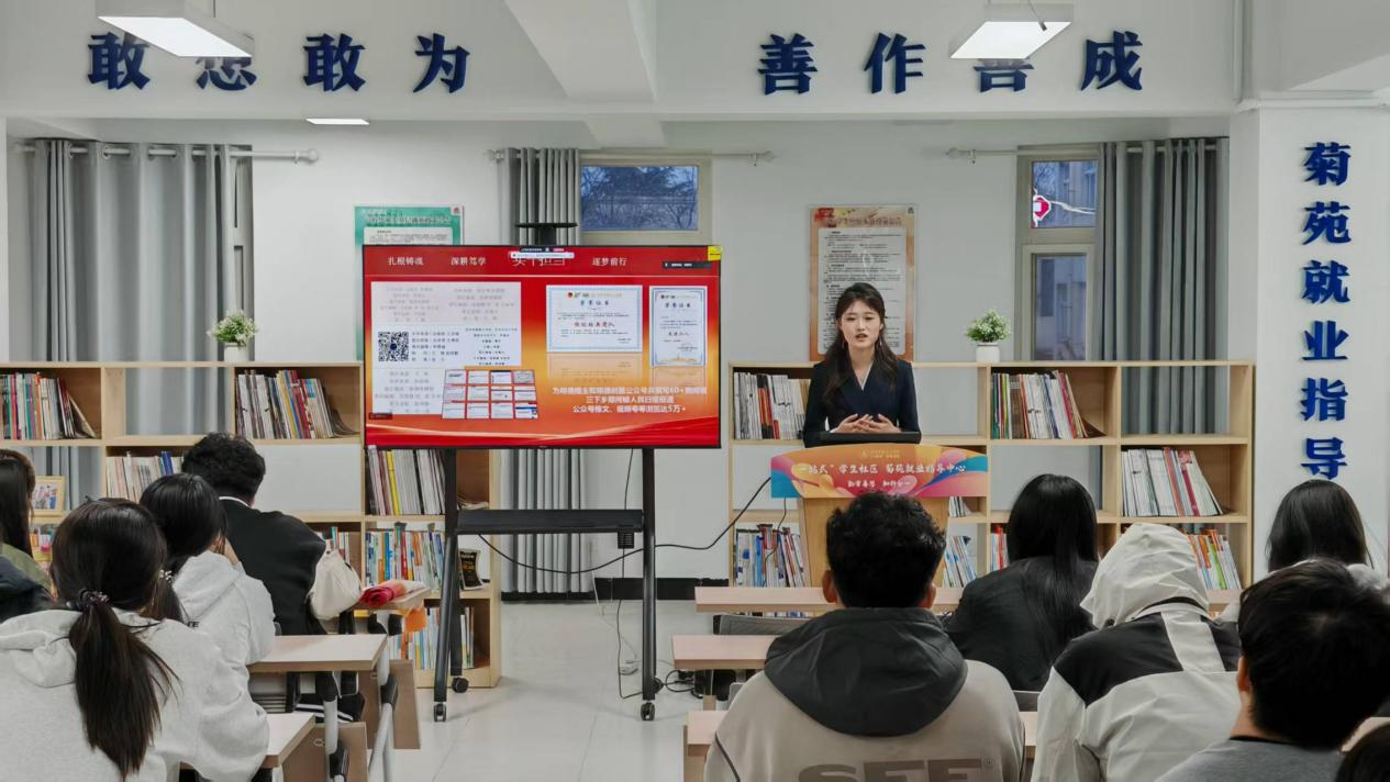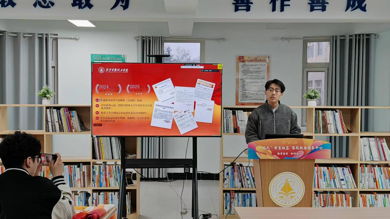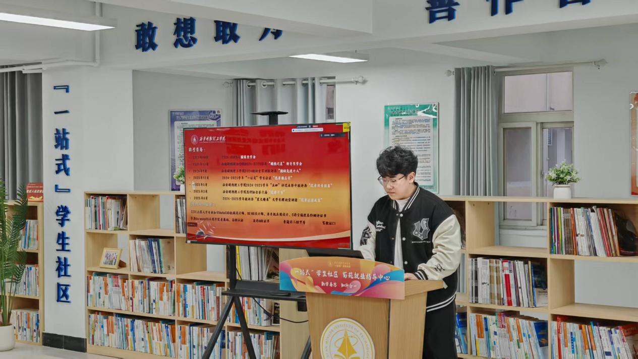 本次活动采用两校区联动模式,线下主会场设在长安校区菊苑“一站式”就业服务中心,现场座无虚席。莲湖校区学子通过线上直播同步聆听,打破空间限制,实现全员参与。五位优秀大学生代表依次登台,用亲身经历讲述青春奋斗故事,传递榜样力量。
