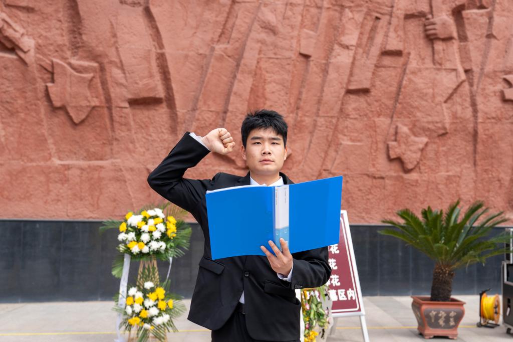 活动现场,退伍学生代表王正升、学生代表郭皓阳、国旗护卫队代表先后发言,结合自身经历讲述对英烈精神的理解,表达新时代青年传承红色基因、勇担时代使命的坚定决心。“革命先烈用鲜血和生命换来了今天的和平生活,作为退伍大学生,我更要做到退伍不退志、退役不褪色,以实际行动践行青年责任。”王正升的发言引发在场师生强烈共鸣。随后,全体人员在领誓人牛威策的带领下集体宣读缅怀先烈誓词,铮铮誓言在陵园上空回响,彰显着青年学子“请党放心、强国有我”的青春担当。