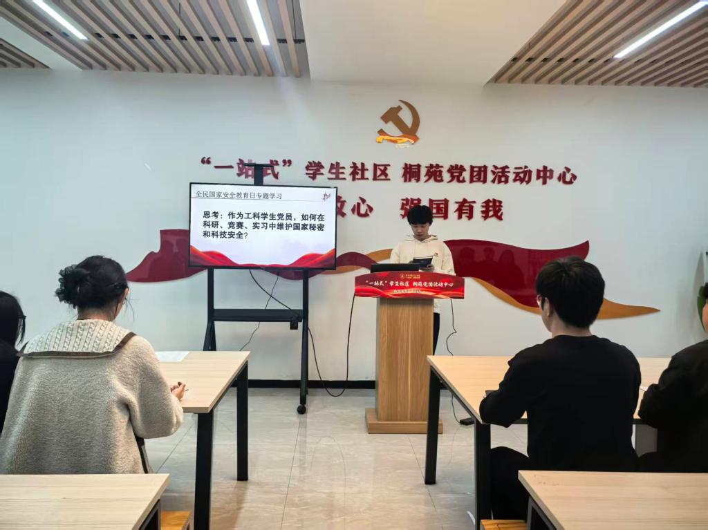 在第十一个全民国家安全教育日到来之际,为深入贯彻落实总体国家安全观,增强学生党员维护国家安全的责任感与使命感,特别是引导工科专业学生党员在科研、竞赛、实习中严守国家秘密与科技安全。4月14日,智能制造与控制技术学院学生第一党支部在桐苑党团服务中心组织开展了“赓续红色血脉,筑牢安全防线”主题党日活动。本次活动由支部书记周佳琪老师主持,支部全体学生党员参加活动。
