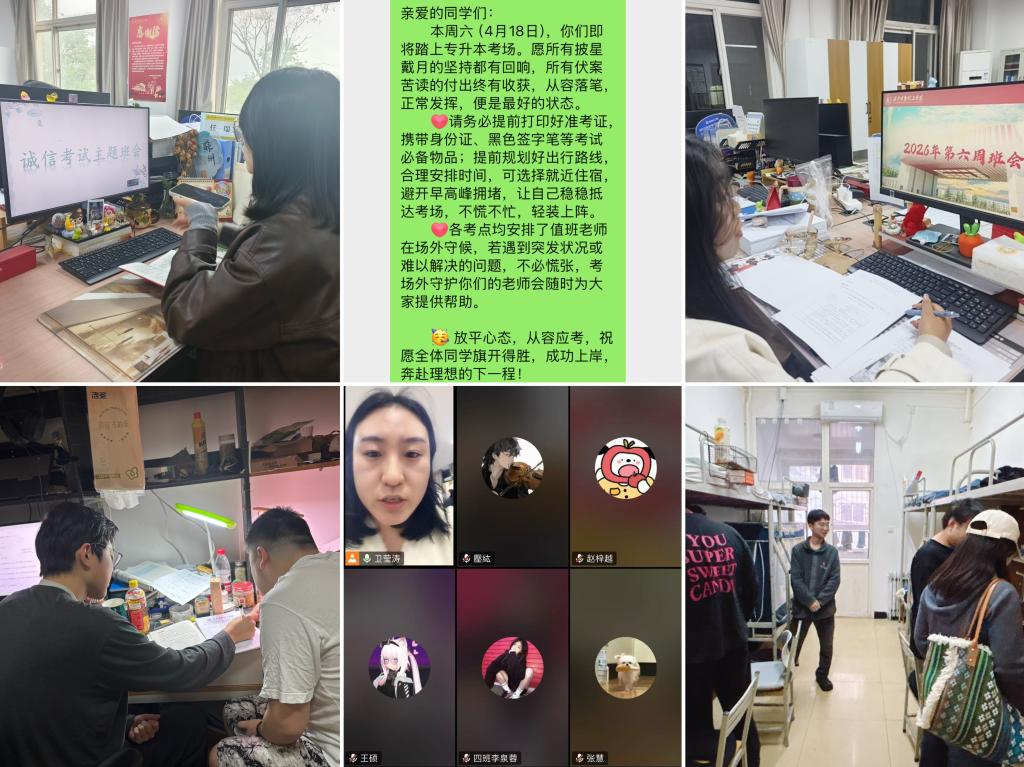 学院坚持教育与关怀同频,做到线上线下双线发力,召开专题考风考纪班会,辅导员结合考试纪律要求、违规违纪案例,向学生细致讲解考场规则,强化诚信考试意识,引导学生严守考试纪律、端正应考态度;同时全面摸排学生备考状态,针对备考压力大、情绪焦虑、学习薄弱的重点学生,逐一开展面对面谈心谈话,深入学生宿舍走访慰问,耐心疏导心理压力,叮嘱学生合理作息、调整心态,并通过班级微信群持续推送考试时间、考点路线、证件文具备齐、出行饮食安全等温馨提醒,实时解答学生各类疑问,把暖心关怀融入备考每一个细节。