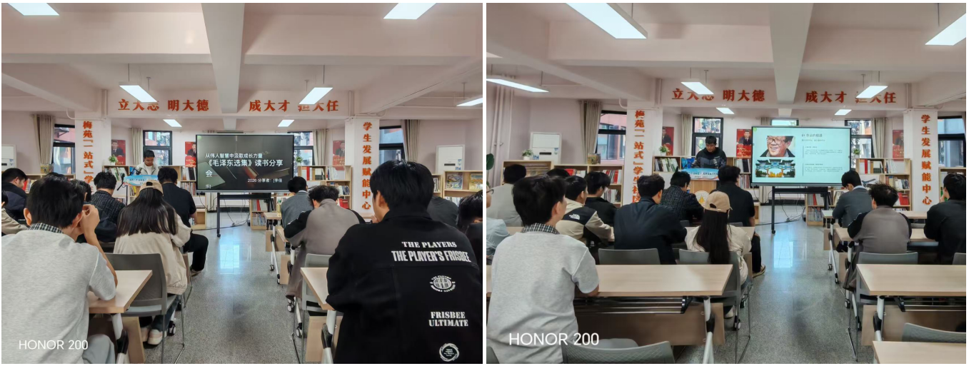 李佳乐同学围绕《毛泽东选集》展开分享,从书中的思想智慧、实践方法论出发,结合专业学习与青年成长,阐述了经典著作对当代大学生树立正确三观、提升思辨能力的重要意义,让大家感受到红色经典的恒久魅力。李浩源同学则分享了《我与地坛》,带领大家感悟作者对生命、苦难与亲情的深刻思考,引导大家学会直面挫折、珍惜当下,体悟生命的价值与意义。