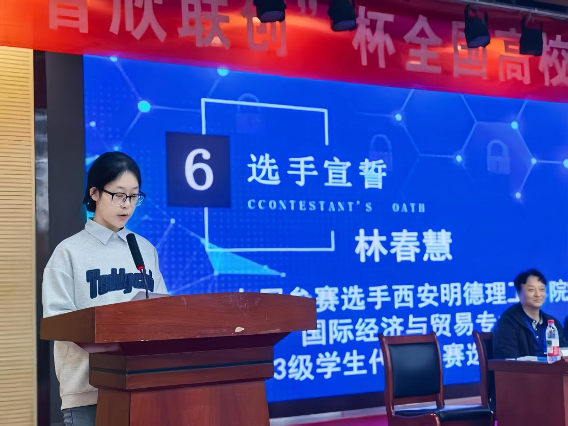 本届大赛技术支持方企业代表辛玉麟先生在讲话中谈到,企业将充分发挥技术优势,为赛事提供全方位支持,助力打造公平、专业的竞技环境。大赛裁判长、山东外国语职业大学商学院院长赵加平教授,西安明德理工学院国际经济与贸易专业学生林春慧先后代表裁判员、参赛学生进行宣誓。
