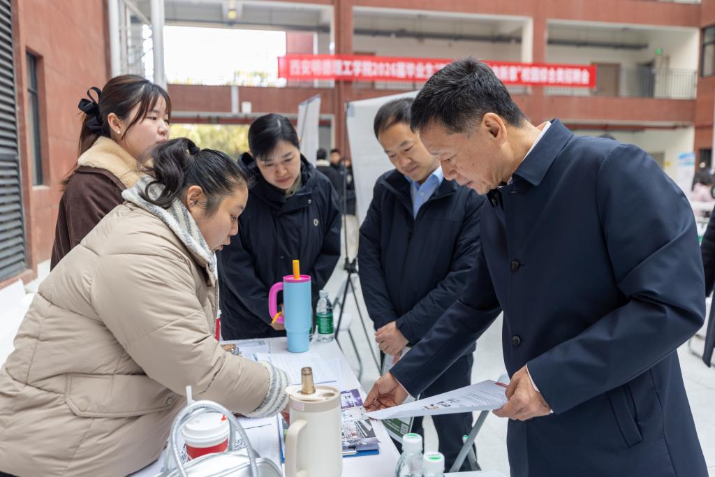学校党委书记马川鑫、校长助理刘佳在招生就业中心副主任侯磊的陪同下深入招聘会场,主动与人社局工作人员及用人单位沟通交流,征询对学校人才培养的意见建议,为进一步深化校企合作、推进实习基地建设及优化课程体系等提供了有效依据。各学院党委书记(党总支书记)、毕业班辅导员及招生就业中心工作人员深入招聘会现场,结合学院学科专业优势与人才培养成效,与企业代表开展深度交流,细致研判企业岗位需求及行业发展动态,精准推荐优秀毕业生。长安、高陵两区人社局代表分别介绍各自区域人才引进、就业见习、自主创业税收减免等政策。招生就业中心在现场设置了就业指导处并安排专人为毕业生提供就业政策咨询、简历修改、求职面试技巧指导等帮助。学校人武部也安排专人介绍大学生应征入伍流程、优待政策。