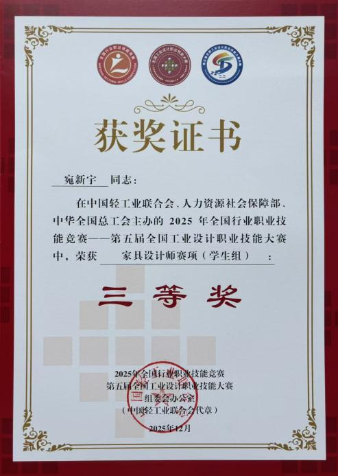 我院工业设计专业学生宛新宇在该赛事陕西省家具设计师专项选拔赛中取得优秀成绩,被省赛组委会推荐代表陕西省参加全国总决赛。从省赛到国赛,经过为期两个月的赛前准备,在国赛中经过理论笔试、设计实操和现场加工制作三个环节的严格筛选,取得了家具设计师专项(学生组)国赛铜奖的优异成绩,这是我院学生在本赛事专项中的首次获奖,实现了从参与式的“积累经验”到获奖的突破。