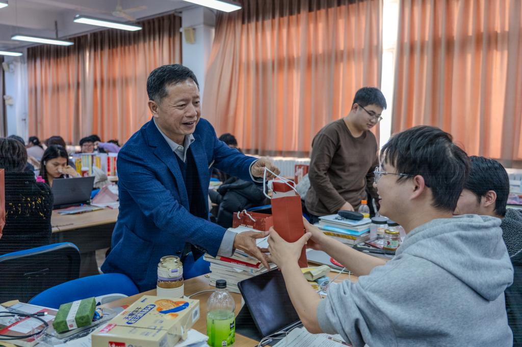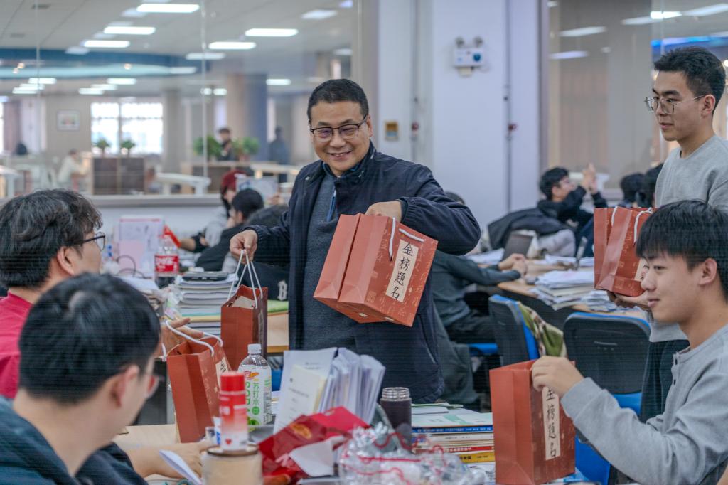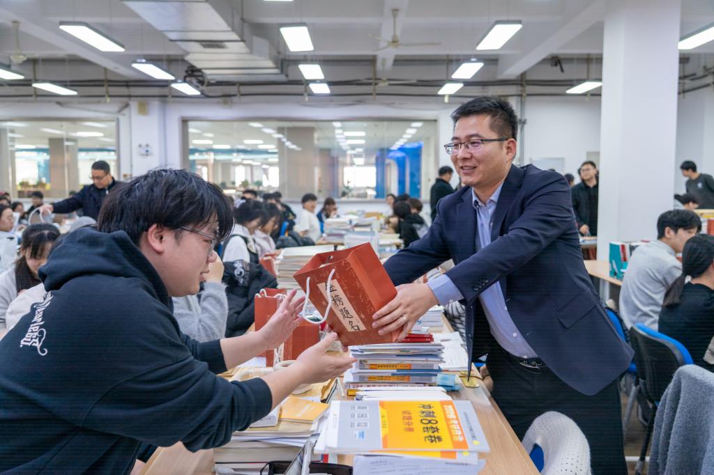随后,校领导为在场学子发放满载着祝福与关怀的“考研能量包”,并与同学们亲切交流,了解他们的复习进度和实际需求。