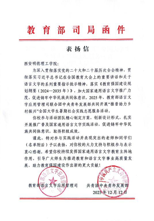 近日,学校收到教育部语言文字应用管理司与共青团中央青年发展部联合印发的表扬信,对“心相通·语先行”赴新疆若羌推普实践队在2025年“推普助力乡村振兴”全国大学生暑期社会实践志愿服务活动中的突出表现予以高度肯定。表扬信指出,学校团队“精心制定方案,创新设计形式,扎实开展推广普及国家通用语言文字实践活动,促进铸牢中华民族共同体意识,取得积极成效”,并对参与实践的师生及学校的大力支持表示感谢。