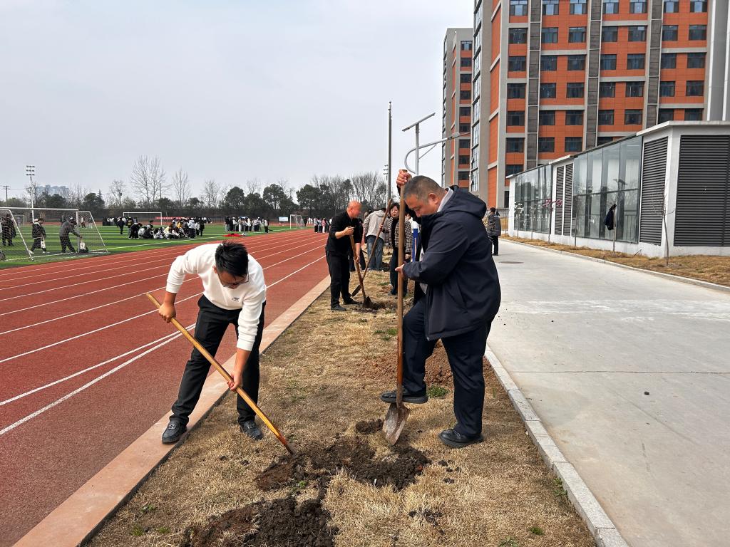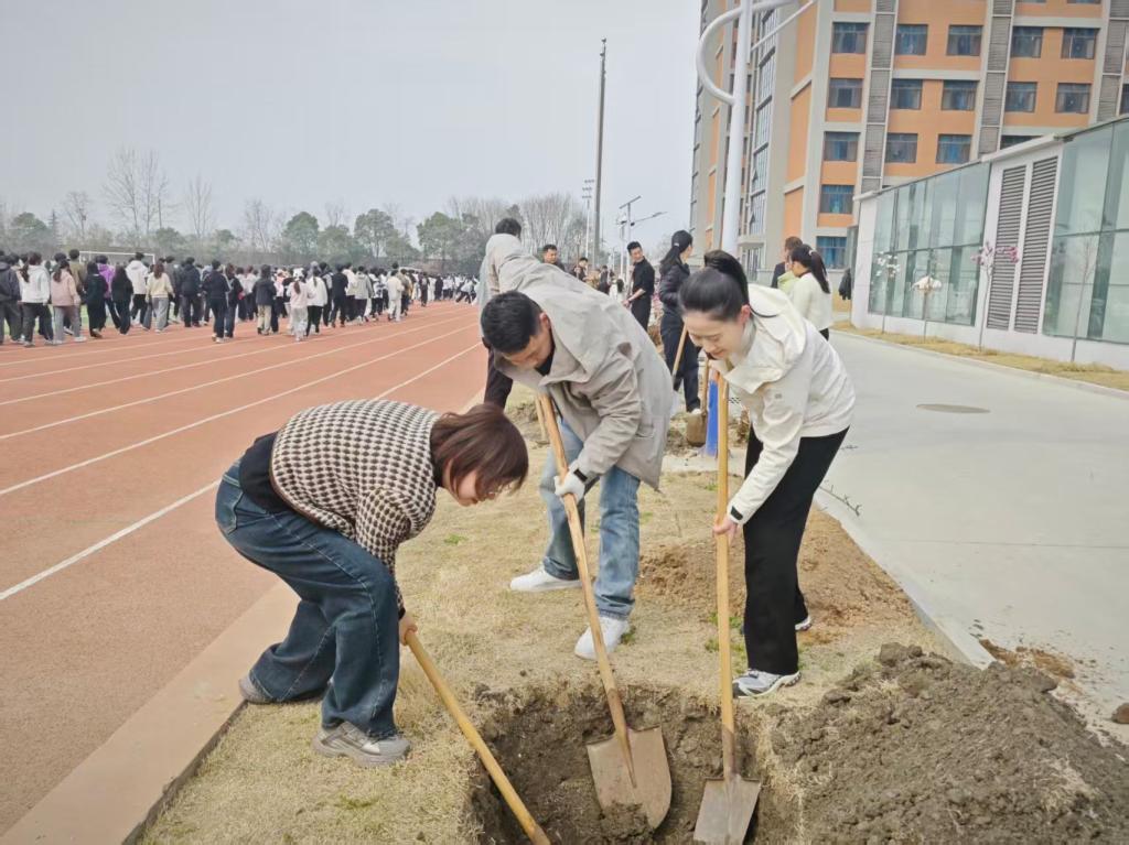大家挥锹铲土,挖坑定植;并肩扶苗,填土压实;围堰浇水,精心养护,全程有条不紊、认真细致。劳动过程中,校领导带头参与植树劳动,与大家并肩劳作,默契完成挖坑、扶苗、填土、浇灌等工序,现场一派热火朝天的劳动景象。