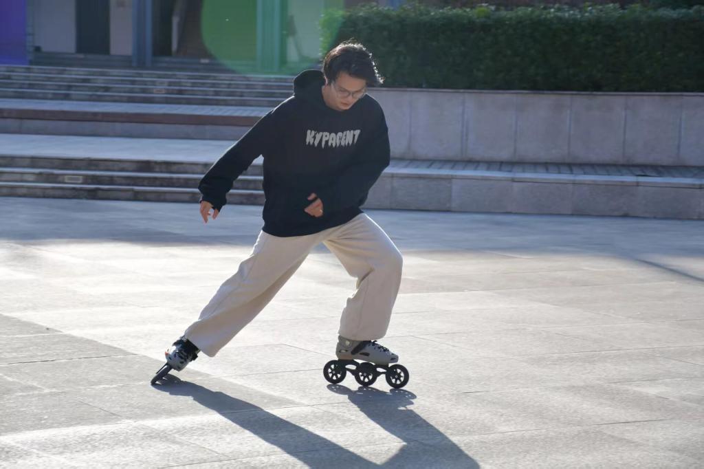 下沉广场上,轮滑社与滑板社同场展示,形成一道动感十足的风景线。轮滑社队员们脚踏疾风,以流畅的“S形绕桩”与“交叉滑行”展现精湛技艺;滑板社成员则通过精准的踩踏、腾跃与翻转,在方寸板面上演绎着平衡与创意的完美融合。两个社团各展所长,他们灵动的身影、矫健的姿态,不仅是体育技能的精彩展示,更是青春活力与团队精神的生动诠释,充分响应了“让学生在体育锻炼中享受乐趣、增强体质、健全人格、锤炼意志”的号召。