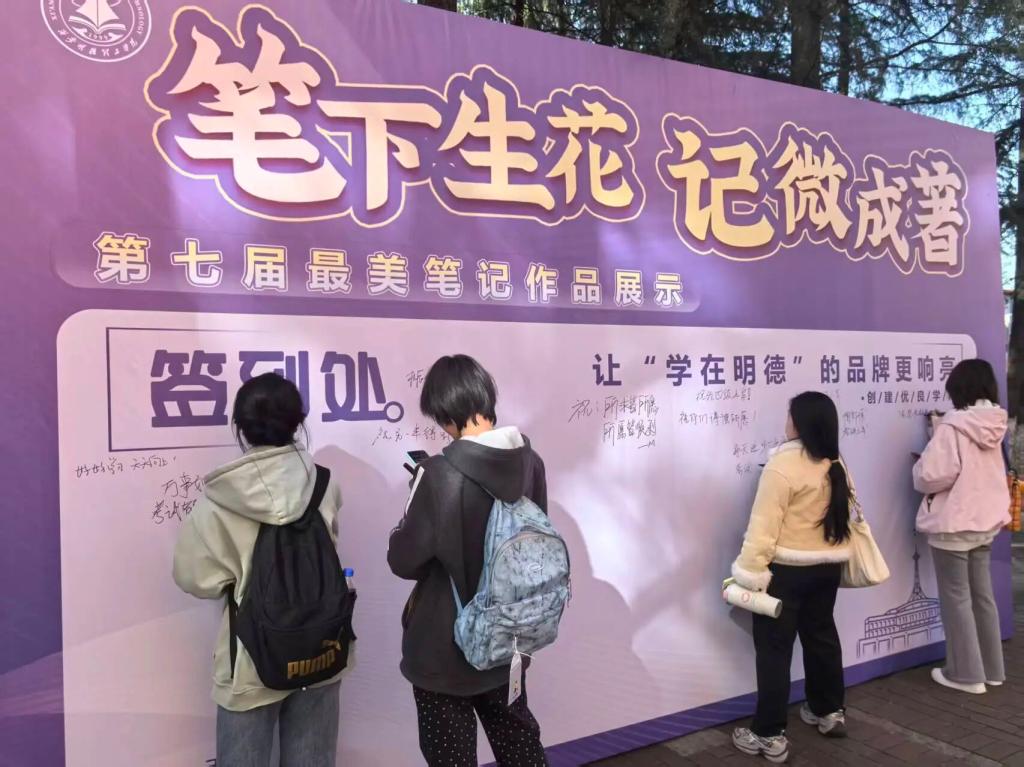 在芳菲林片区,美育实践与传统文化交融共生。书画协会以林为展,现场挥毫创作“明德、亲民、至善”等作品,将汉字之美与自然之景相融,让学生在墨韵中感受笔端流淌的艺术魅力;“学在明德”优秀笔记主题展与“文明养成”签字墙活动,则将美育与德育紧密融合,引导学生发现学习之美、行为之美。云上电影社设置的石膏娃娃彩绘、传统拓印等体验区,让学生在实践中感受艺术创作的乐趣,提升动手能力与审美素养。