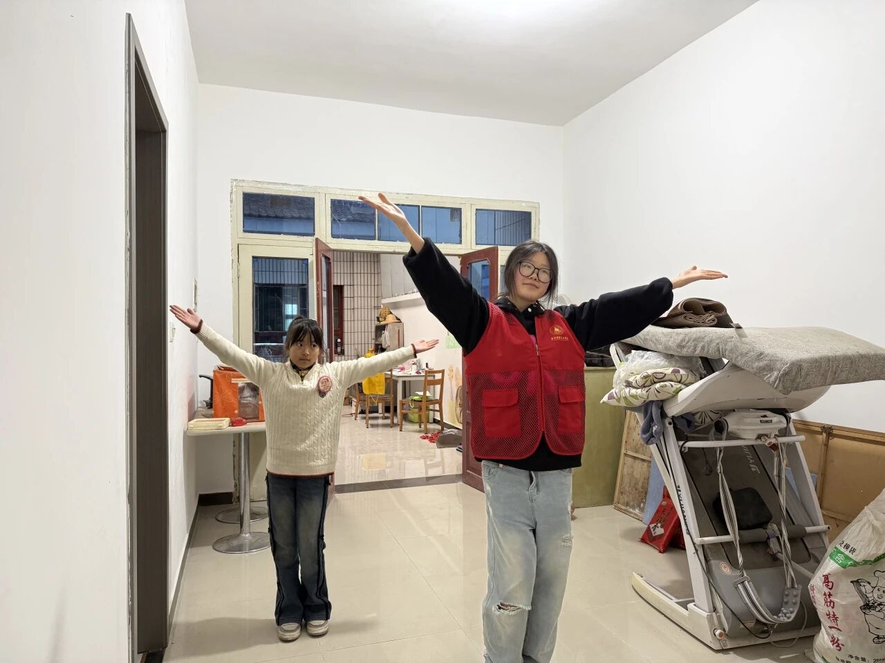 除了课业辅导,志愿者们还带领孩子们为“文化下乡”活动排练舞蹈。在志愿者的耐心教导下,孩子们踩着欢快的节拍反复练习,个个充满活力,洋溢着开心的笑脸。