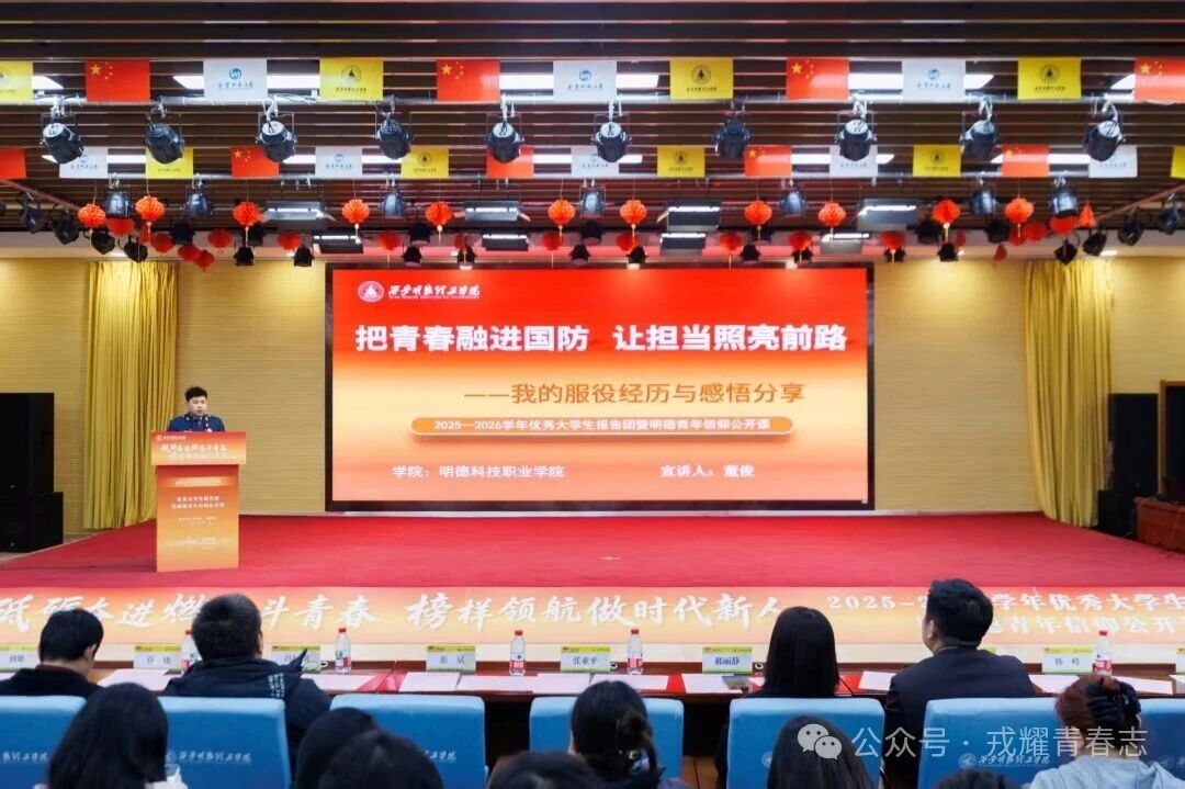 为深入推进国防教育进校园,充分发挥退役大学生士兵的榜样引领作用,我校2025—2026学年优秀大学生报告会暨明德青年信仰公开课顺利举办。来自戎耀国防教育中心的退役大学生士兵董俊,以《把青春融进国防,让担当照亮前路》为题,为全校师生带来了一场兼具思想深度与情感温度的国防教育宣讲。