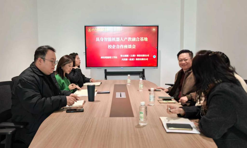 2026 年 1 月 9 日,创新创业学院与凌云光技术股份有限公司、智元创新(上海)科技有限公司、大技狮(北京)科技有限公司在学院会议室召开具身智能机器人产教融合基地校企合作座谈会。凌云光技术股份有限公司西北区产教负责人刘朝辉,智元创新(上海)科技有限公司、大技狮(北京)科技有限公司行业拓展全国总监吴斌、卢秀萍代表企业出席会议。西安明德理工学院校企合作中心副主任、创新创业学院副院长崔岩,学院教师刘强、工作室负责人屈菲菲参加会议,会议由学院办公室主任奚颖主持。