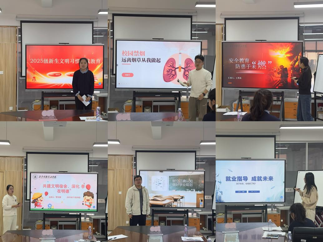 本次班会评比活动围绕“学在明德”主题,各辅导员结合所带学生特点和当前实际需求,从学生日常行为教育,文明校园创建,学生安全健康教育,考风考纪教育,防诈骗教育,职业生涯规划,就业求职指导等方面进行班会现场展示。辅导员们结合工作实际,通过专业的理论,丰富的案例将思想政治教育元素融入班会主题,展现了独特的工作思路、教育方法和扎实的业务功底。
