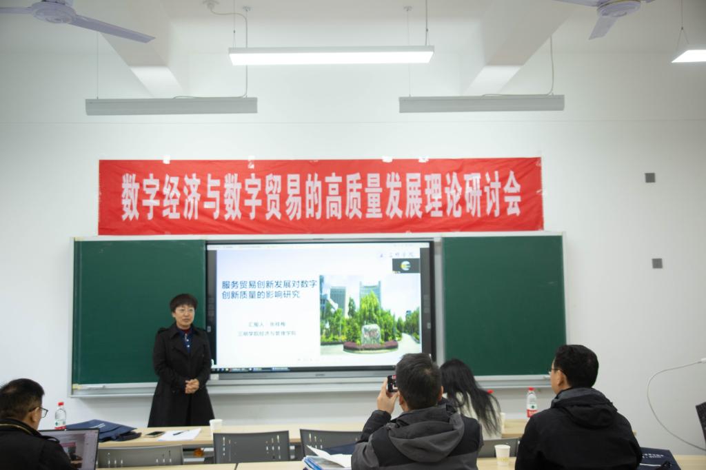 陈岩教授以面向“十五五”的数字中国高质量发展与数字贸易新机遇为主题,结合国家“十五五”规划,分析了数字中国建设与数字贸易发展的内在关联,提出应把握数字技术赋能带来的贸易升级契机。张志明教授聚焦“一带一路”建设安全,强调需高度重视中欧班列中断风险,从物流保障、合作机制等方面提出风险防控建议。汪占熬教授深入剖析了欧美“去风险”政策对中国民营企业全球资源配置造成的困境,从政策支持、企业战略调整等维度给出应对策略。张桂梅教授聚焦服务贸易与数字创新的互动关系,通过实证研究揭示了服务贸易创新发展对提升数字创新质量的积极效应。