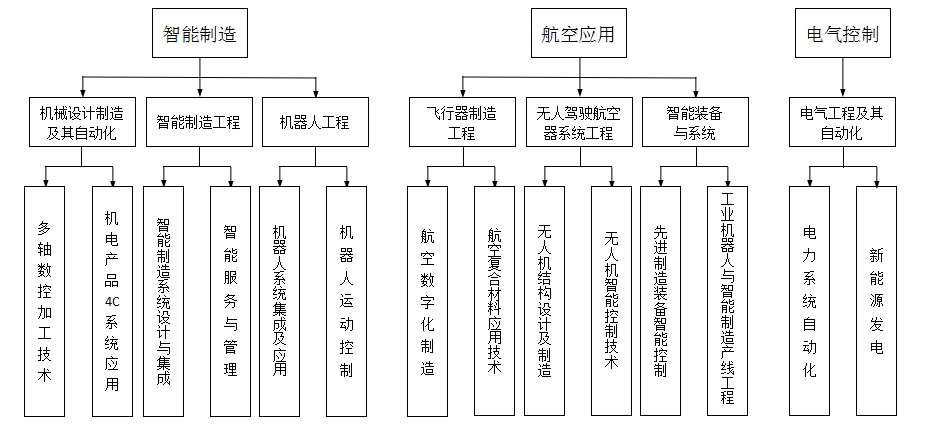 智能制造与控制技术学院面向智能制造、智能控制以及航空航天领域的新技术、新模式、新变革的人才需求,重点在航空复杂产品多轴数控加工技术、机电产品4C系统应用(CAD/CAM/CAE/CAPP)、智能制造系统设计与集成、智能服务与管理、航空数字化制造方向、航空复合材料应用技术、电力系统自动化、新能源发电、机器人系统集成及应用、机器人运动控制、无人机结构设计及制造、无人机智能控制技术、先进制造装备智能控制、工业机器人与智能制造产线工程等十四个方向开展“一专多能”“产学研用”多方位协同育人的高素质应用型人才培养。