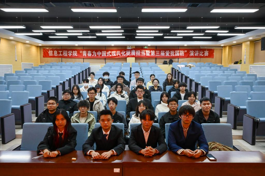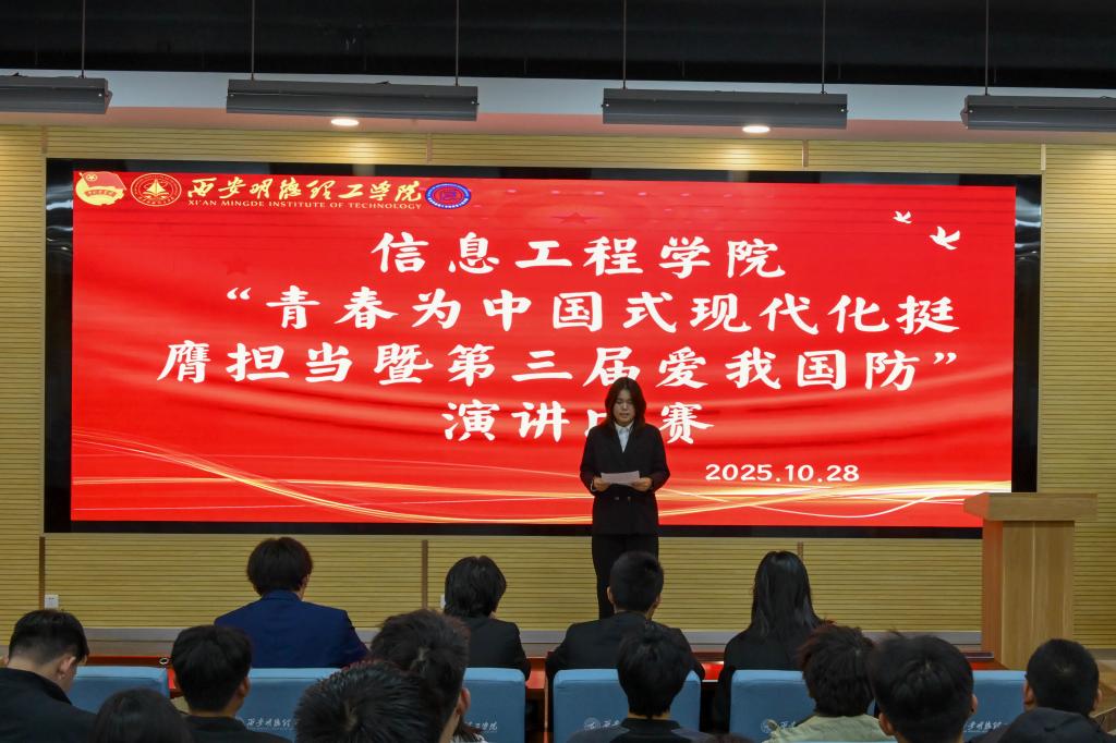 2025年10月22日,信息工程学院在明理楼201报告厅举办“爱我国防”主题演讲比赛。青春是国家发展的鲜活力量,青年学子是国防建设的新生动能,当代青年当以青春之智、实干之行,践行“科技报国、强国有我”的时代承诺,让爱国情怀在青春奋斗中绽放光芒。