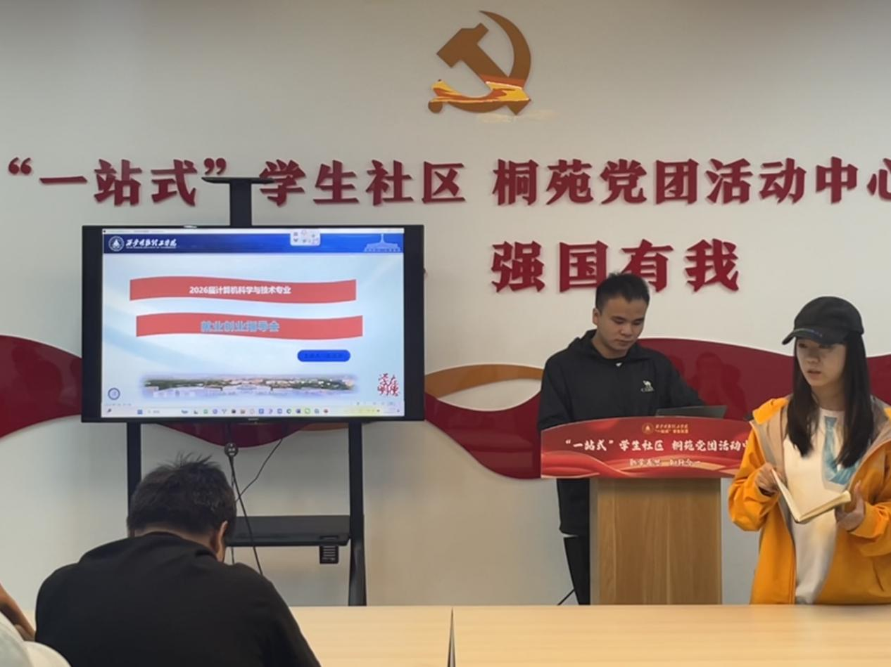 9月17日,2026届计算机科学与技术专业101012208、101012209班学生在桐苑“一站式”学生社区开展就业创业指导班会,会议由辅导员王雨涵主持,主要内容包括2026届就业实习政策讲解、校外实习安全准则等,旨在帮助学生树立科学就业观。