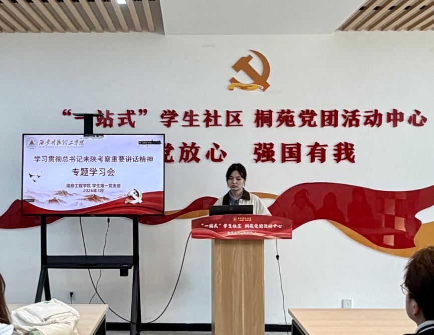 为深入学习贯彻习近平总书记来陕考察重要讲话重要指示精神,引导支部党员厚植家国情怀、勇担时代使命。3月11日,信息工程学院学生第一党支部在“一站式”学生社区桐苑党团活动中心召开专题学习会,组织全体党员开展集中学习与交流研讨。会议由支部书记张蓉主持。