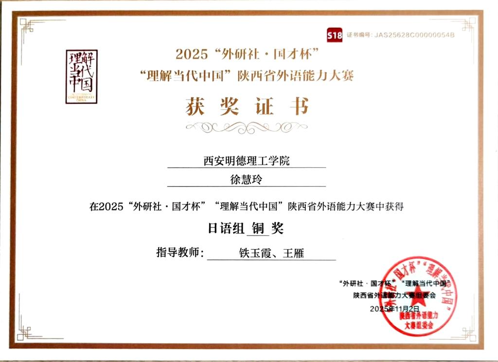 西安明德理工学院日语专业学生在2025“外研社·国才杯”“理解当代中国”多语种比赛中获得省赛铜奖