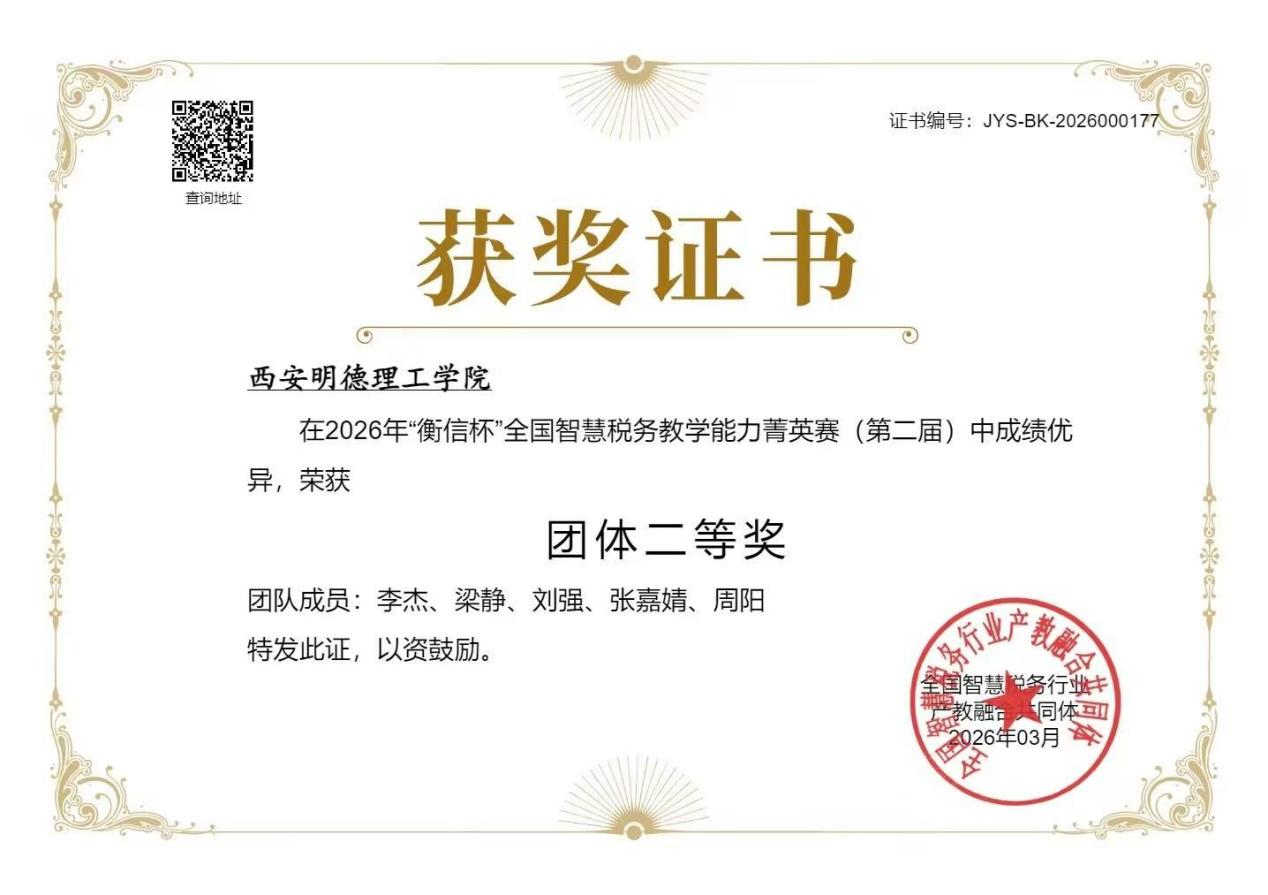 近日,第二届“衡信杯”全国智慧税务教学能力菁英赛圆满落幕,经济与管理学院会计学专业教师积极备赛,表现优异,最终斩获团队二等奖,其中李杰、梁静荣获个人总分三等奖,展现了明德教师扎实的专业素养与教学潜力,他们在竞赛中展现的专注与钻研精神,是对学校教师队伍专业能力的生动诠释。
