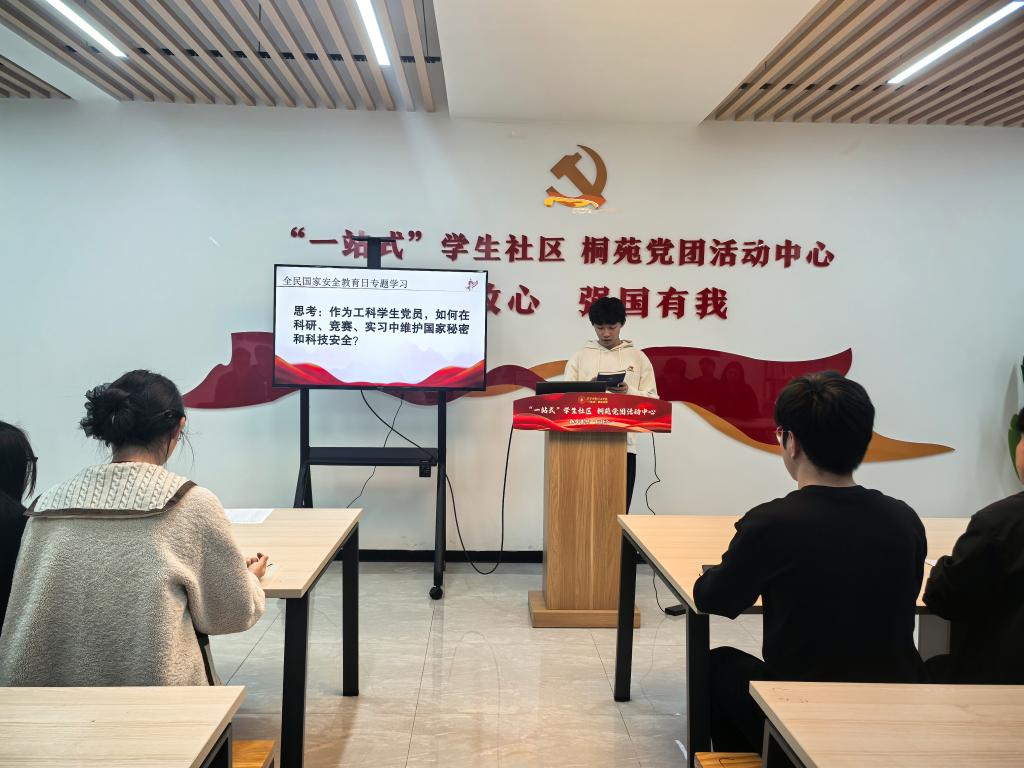 活动伊始,周佳琪以“赓续红色血脉,筑牢安全防线”为题作现场授课。她带领大家回顾了全民国家安全教育日的设立背景与重要意义,强调国家安全是安邦定国的重要基石,是每一位公民尤其是党员必须时刻牢记的“国之大者”。结合当前复杂的国际形势和科技竞争态势,周佳琪指出,作为工科学生,大家日常参与的科研项目、学科竞赛以及企业实习,往往涉及前沿技术、核心数据甚至敏感信息,稍有不慎就可能成为境外势力窃取情报的突破口。她通过剖析近年来发生在高校和科研院所的失泄密典型案例,警示同学们要时刻绷紧安全之弦,将“红色血脉”中蕴含的忠诚、担当、保密、奉献精神转化为守护国家科技安全的实际行动。