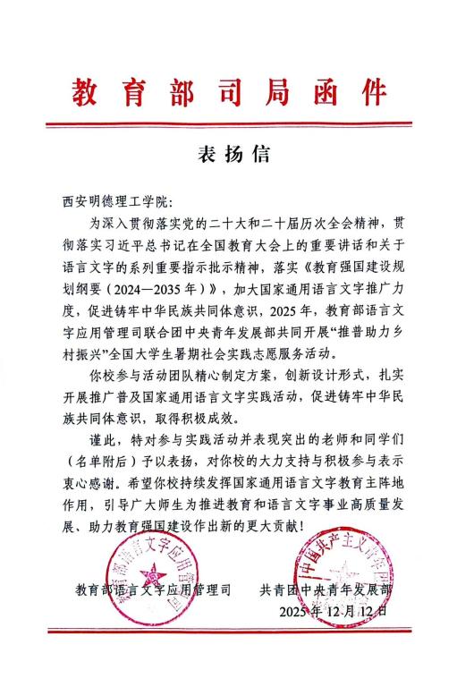 近日,教育部语言文字应用管理司与共青团中央青年发展部联合公布2025年“推普助力乡村振兴”全国大学生暑期社会实践志愿服务活动评优结果,西安明德理工学院艺术与设计学院“心相通·语先行”推普助力乡村振兴暑期社会实践队凭借创新实践、扎实成效,从全国2000支参评团队中脱颖而出,荣获全国“优秀团队”称号,获主办单位联合表扬,彰显学校以专业赋能乡村振兴、以实践培育时代新人的显著成效。