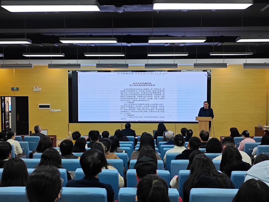3月25日下午,语言文化传播学院在建德楼201报告厅召开2026年重点教学工作部署会。全体教职工参会,学院党委书记赵旭东主持会议。