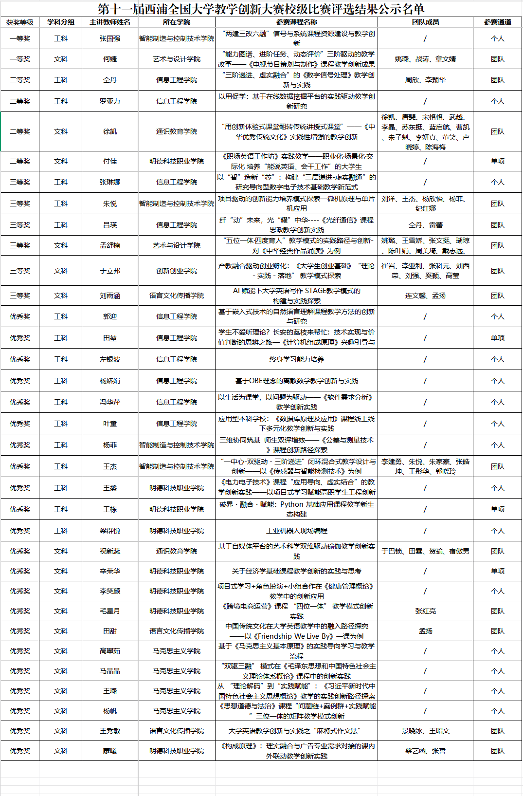 根据《关于举办第十一届西浦全国大学教学创新大赛校级比赛的通知》的相关精神,经各学院推荐、教师个人申报、专家初审及复审等环节,共评选出一等奖2名,二等奖4名,三等奖6名,优秀奖22名。现将第十一届西浦全国大学教学创新大赛校级比赛评选结果进行公示,名单见下图。