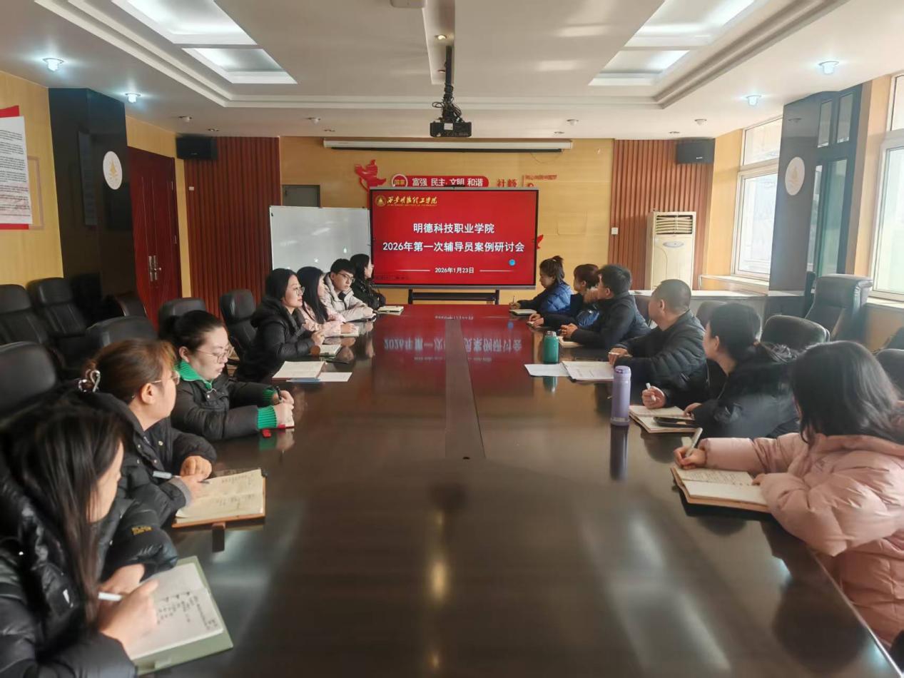 为进一步提升辅导员队伍专业化水平,强化学生工作案例分析与应急处理能力,1月23日中午,明德科技职业学院在明理楼216会议室组织召开2026年第一次辅导员工作案例研讨会。学院党总支副书记王飞及全体辅导员参加研讨。