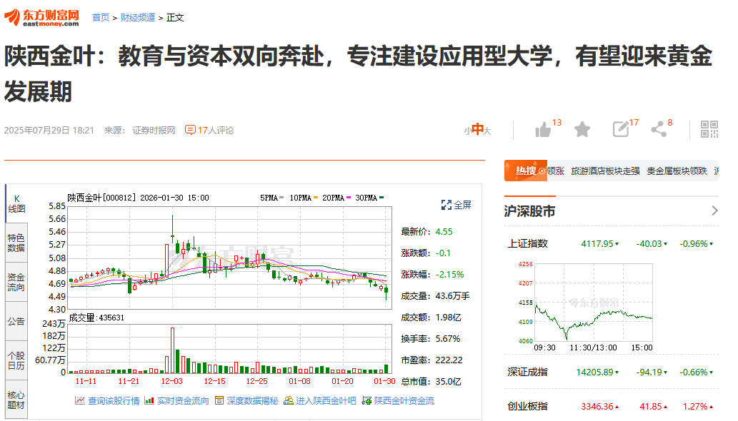 陕西金叶恰好站在共振中心:一方面,西安明德理工学院将于2026年迎来教育部本科教学工作合格评估,通过后有望在未来申报硕士学位授权单位,进一步增强招生吸引力;另一方面,学校在AI智能教学、AI催化学科融合方面的先发优势,让教育事业的成长性进一步凸显,AI驱动教育行业估值中枢上移的逻辑由此成立。