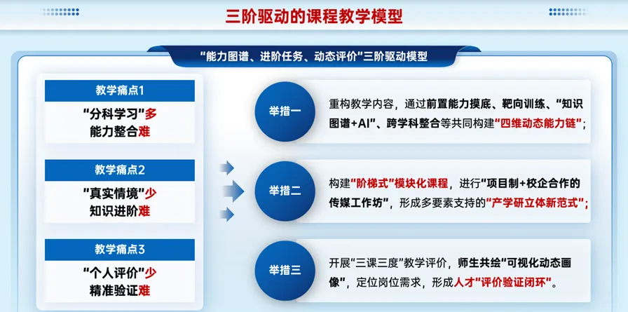 团队立足教情学情,构建了“能力图谱、进阶任务、动态评价”三阶驱动的教学改革模型;通过重构项目化教学内容,联合陕西广电融媒体、西安广播电视台等媒体单位,搭建了产教融合的实践平台,形成了项目制教学与传媒工作坊相结合的新模式。