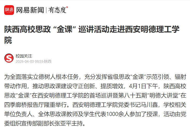此次陕西高校思政“金课”巡讲,是西安明德理工学院深化思政课改革创新、推动优质资源共享、构建“大思政”工作格局的重要举措。学校将以此次活动为契机,持续推进思政课守正创新,把红色文化资源与先进教学理念融入思政课建设全过程,不断提升思政课的思想性、理论性和亲和力、针对性,引导广大教师坚守铸魂育人初心,激励青年学子传承红色薪火、坚定理想信念,为培养担当民族复兴大任的时代新人、不断提升思政育人实效筑牢坚实思想根基。