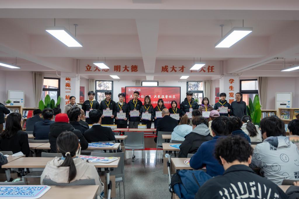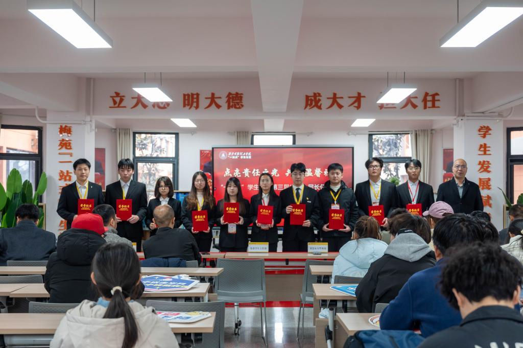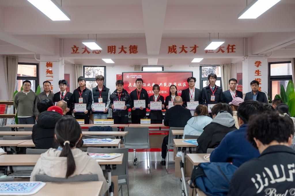 智能制造与控制技术学院党委副书记曾凯、语言文化传播学院党委副书记杨峰、经济与管理学院党委副书记冯纪潮为楼长代表颁发聘书及工作牌。