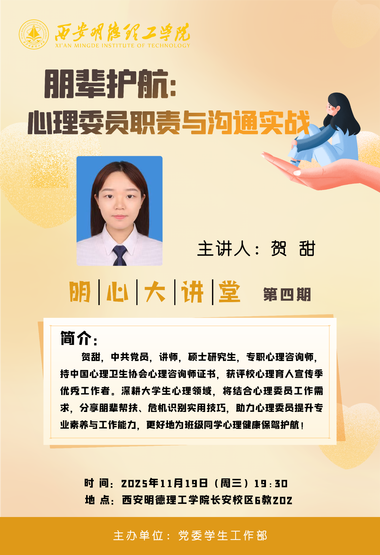 一、培训时间2025年11月19日 19:30二、培训地点西安明德理工学院长安校区6教202三、报告会专家党委学生工作部 贺甜四、培训对象 明德科技职业学院(南校区)、语言文化传播学院班级与宿舍心理委员周三我们不见不散~