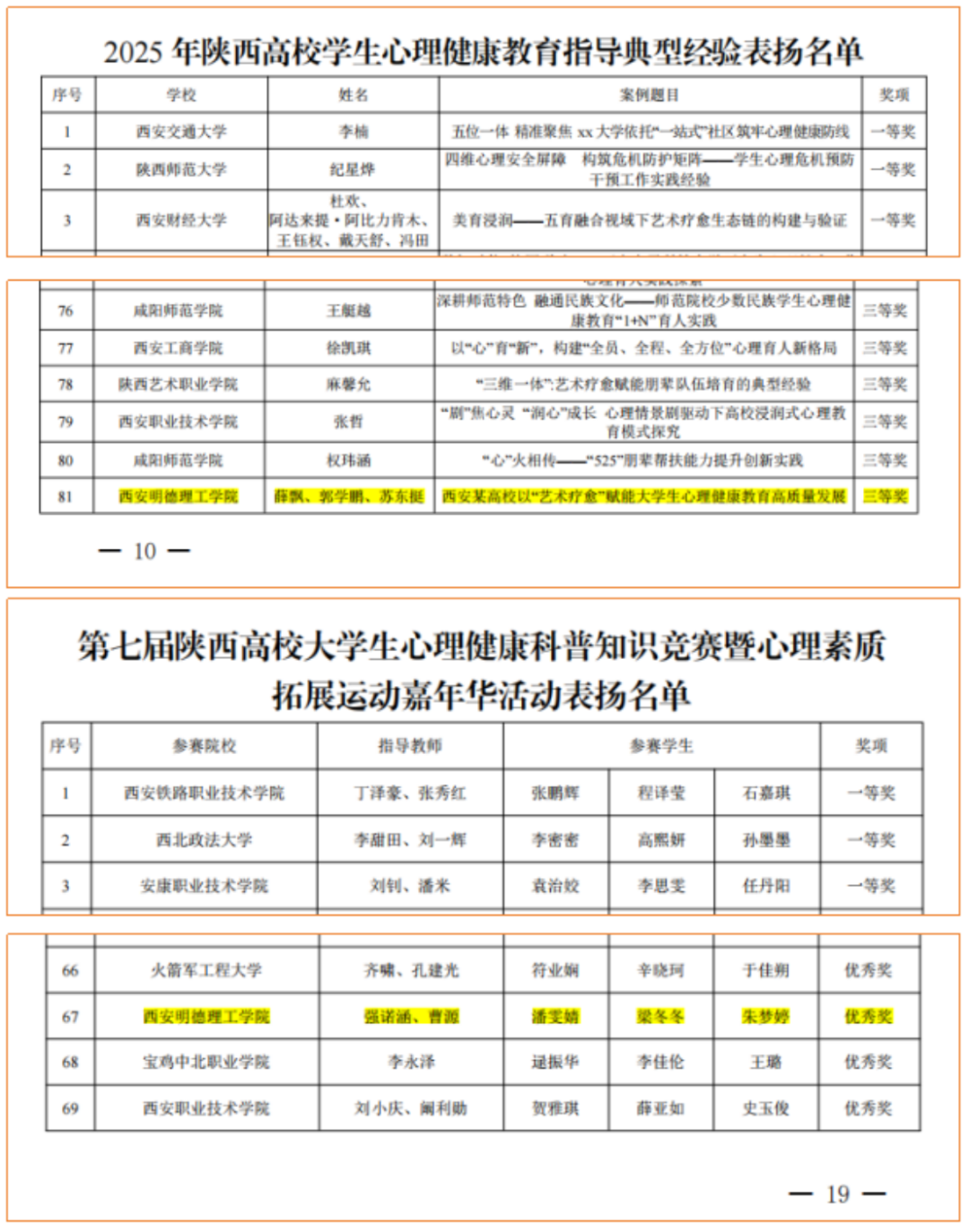 扎实举办第十届“阳光护航”心理育人宣传季暨第二届艺术疗愈文化节活动,累计开展53项省校级实践活动,参与师生16000余人次,荣获陕西省高校心理健康典型经验三等奖1项、科普知识竞赛优秀奖1项。面向全校本专科学生,创新开展大学生心理健康教育中心开放周系列活动,学生对中心场地、预约方式、师资力量等知晓率达99%。在长安校区和莲湖校区同步开展学校第二届心理游园会活动,累计参与学生2000余人次。