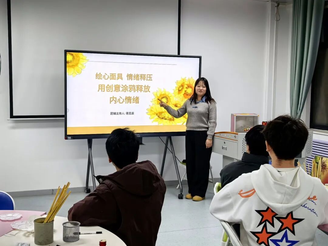 为帮助学生识别与表达情绪,借助艺术形式释放压力,12月17日晚,大学生心理健康中心联合蒲公英励学协会在明心楼203室开展了“绘心面具,情绪释压”心理团辅活动。本次活动由蒋昱辰老师指导,学生自主报名,通过绘画与互动形式,引导学生进行情绪表达与释放。