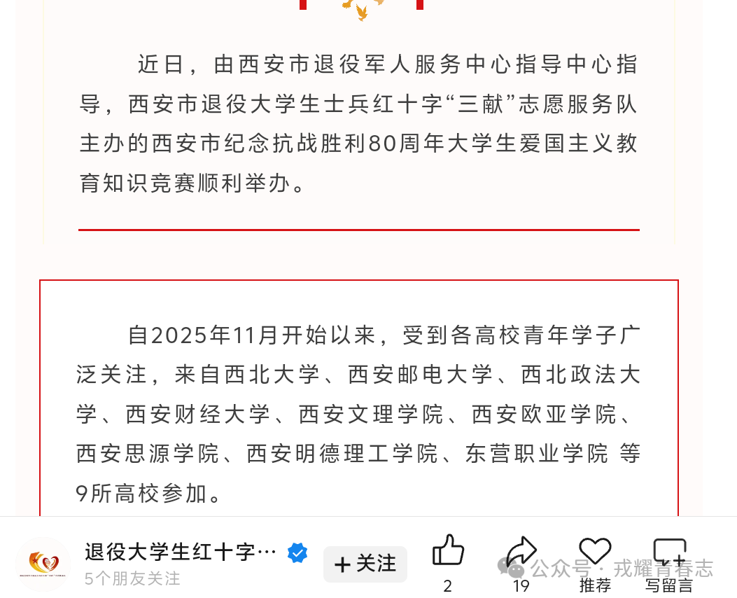 80载岁月峥嵘,抗战精神永存;青春志承家国,答题场上竞风流。近日,西安市纪念抗战胜利80周年大学生爱国主义教育知识竞赛圆满落幕,我校学子以线上作答的形式踊跃参与,凭借扎实的知识储备与赤诚的爱国情怀脱颖而出,斩获优异成绩,用青春行动诠释了新时代青年对伟大抗战精神的传承与坚守。